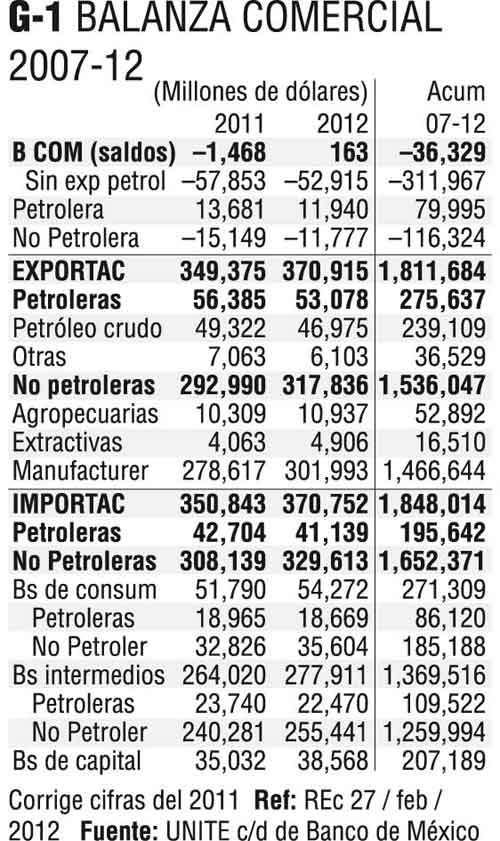 esde la megacrisis de 95-97 que desplomó la economía, el país no había registrado un saldo positivo en Balanza Comercial hasta 2012, año en que se logró un mínimo pero significativo superávit de 163 millones de dólares, resultante de una exportación total de bienes por 370 mil 915 millones y una importación por 370 mil 752 m (Gráfico 1).