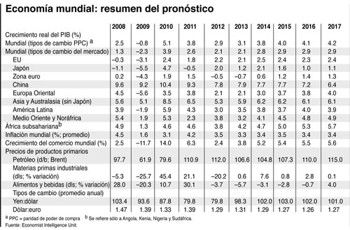 Ahora que las perspectivas de recuperación flaquean en varios países, los bancos centrales inundan la economía global con dinero barato en un esfuerzo por revivir el crecimiento. En las primeras dos semanas de mayo hubo una ola de recortes de tasas de interés, que delataron las preocupaciones de los gobernantes por el ambiente de crecimiento. Es debatible hasta qué punto la liberación monetaria siga siendo efectiva dado el clima actual, pero la economía mundial se repara poco a poco a sí misma después de la crisis de años pasados. EIU prevé al menos cierta recuperación del empuje de las principales economías hacia el final de 2013, lo cual pondrá el escenario para un mejor 2014.