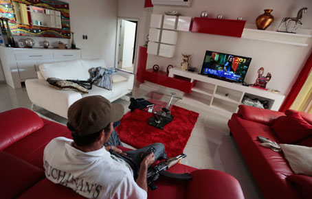 Un integrante de los grupos de autodefensa ve la televisión en la casa de uno de los capos de Los caballeros templarios, quien abandonó Nueva Italia, Michoacán, tras la ocupación de la localidad por la organización comunitaria   Foto Reuters