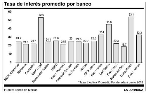 Cuando se habla de intereses de tarjetas de crédito hay que tener en mente que existen dos clases de titulares: los ‘‘totaleros’’ y los ‘‘no totaleros’’. Los primeros no tienen de qué preocuparse, en los hechos no pagan intereses, son los que saldan su cuenta en su totalidad. Otra historia es la de los ‘‘no totaleros’’. No tienen dinero suficiente, van abonando a la tarjeta muchas veces en el esquema de los pagos mínimos. Banco de México dio a conocer ayer un detallado reporte sobre este negocio. En la gráfica anexa puede verse cómo las tasas de interés de los bancos han ido bajando progresivamente y hoy oscilan en 25 por ciento para ambos tipos de cliente. Puede ser que estos datos no coincidan con los que aparecen en tu estado de cuenta, en ese caso debes utilizarlos para pedir una aclaración. ¿Por qué te están cobrando más? Hay algunos muy agresivos como BanCoppel, CrediScotia y ConsuBanco. Capítulo aparte de los intereses son las comisiones. Desde lo que cobran por emitir una tarjeta de crédito hasta por demorarse en el pago. La tarjeta sigue siendo una de las principales fuentes de rendimiento bancario.