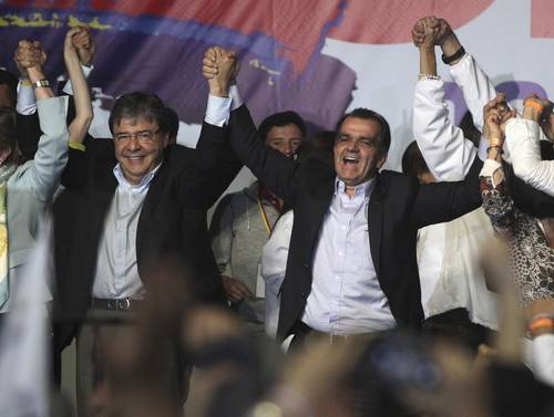 Óscar Iván Zuluaga, de 55 años, economista e impulsado por el ex presidente colombiano Álvaro Uribe, cuya campaña fue sacudida por la captura de un hacker acusado de espiar cuentas de correo electrónico vinculadas al proceso de paz entre el gobierno y las FARC en La Habana con el objetivo de sabotear el diálogo, se alzó ayer con el triunfo en las elecciones por la presidencia, pero sin alcanzar 50 por ciento más uno de los votos. A su lado (de lentes), su compañero de fórmula, Carlos Holmes Trujillo