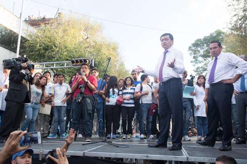 El retumbar del huélum politécnico en las inmediaciones de la Secretaría de Gobernación (SG) provocó un hecho sin precedentes: el responsable de la política interna del país salió de su despacho, caminó hacia el templete de los manifestantes y dialogó con estudiantes. Ahí estaba Miguel Ángel Osorio Chong, frente a la potencia de la Asamblea General Politécnica, pero les anticipó que en esta negociación “no estamos de ninguna manera jugando a las fuercitas. Vamos a ver lo que se deba resolver y lo haremos junto con ustedes”.