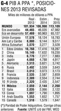 Bajo esta fórmula, en 2013 Estados Unidos conserva su lugar de referencia con un PIB de 16.768 billones, pero China se revalúa a 16.149 billones, con lo que se estima que este año esta última economía es ya, a PPA, la mayor del mundo con 17.632 billones de dólares, seguida por la estadunidense (17.416 b) y la india (7.277 b). México ocupa con esta fórmula el lugar 11 en el mundo con un PIB a PPA de 2.059 billones en 2013.
