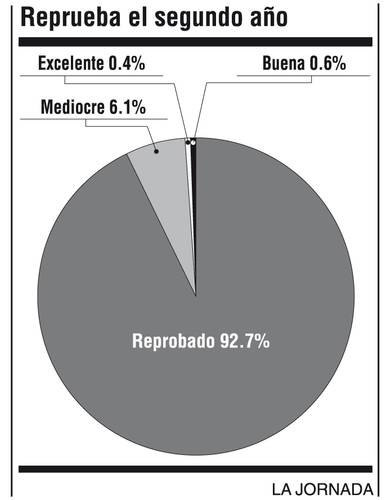 l lunes se cumplen los primeros dos años del sexenio de Enrique Peña Nieto. Esta semana pedimos a nuestros encuestados que calificaran su desempeño. (La calificación máxima es 10, la mínima es cinco o menos.) Dos mil 287 personas lo reprobaron con cinco puntos o menos; 151 personas lo consideran “mediocre (seis a siete)”; 16 personas lo calificaron de “Bueno (ocho a nueve)” y sólo 11 personas le dieron un “excelente (10)”.