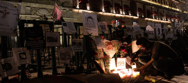 En recuerdo de los estudiantes de Ayotzinapa atacados por policías en Iguala, Guerrero, la noche del 26 de septiembre, cientos de personas colocaron ayer flores, pancartas y veladoras en las rejas que rodean el edificio. La acción respondió a una convocatoria hecha en redes sociales durante esta semana   Foto Yazmín Ortega Cortés