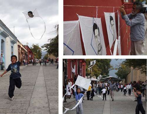 El pintor Francisco Toledo elaboró, con la ayuda de trabajadores del Taller Arte y Papel de San Agustín Etla, 43 papalotes con los rostros de los estudiantes de la Escuela Normal Rural Raúl Isidro Burgos de Ayotzinapa, Guerrero, mismos que junto con niños de distintas escuelas y usuarios que cotidianamente visitan el Instituto de Artes Gráficas de Oaxaca (Iago) los pusieron a volar en el andador turístico, para exigir justicia por los estudiantes asesinados y desaparecidos en Iguala.