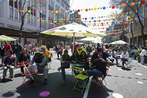 La avenida 20 de Noviembre, en el tramo de Venustiano Carranza a la Plaza de la Constitución, lució ayer con macetas, mesas con sombrillas y sillas de colores, en las que cientos de peatones aprovecharon para tomar un descanso en su paseo dominical.