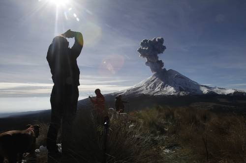 Visitantes al parque nacional Iztaccíhuatl-Popocatépetl observan la columna de ceniza y vapor de agua y gas producto de una explosión volcánica, en diciembre de 2014Foto Foto: J. Guadalupe Pérez