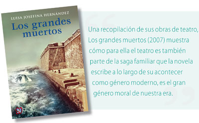 luisa josefina hernández pertenece, pues, a una generación en donde al interés por el teatro se suma una convicción de que el texto dramático tiene una enorme importancia como literatura. En autores como ella y Jorge Ibarguengoitia, entre otros, se establece una continuidad con la práctica teatral de los Contemporáneos, y con la esencial bisagra de Emilio Carballido, un poco mayor que ellos. Y en el teatro, Luisa Josefina Hernández encontró una de sus mejores facultades: la capacidad de escribir diálogos. Una recopilación de sus obras de teatro, Los grandes muertos (2007) muestra cómo para ella el teatro es también parte de la saga familiar que la novela escribe a lo largo de su acontecer como género moderno, es el gran género moral de nuestra era. Pero si escribe para la escena es para sentir su realidad física como respaldo de su realidad psicológica. No obstante, no cambia su sentido entre narrar y teatralizar, pues si bien la inmediatez del teatro (me refiero a su representación) hace más evidente su condición coral, la novela también la tiene. Por ejemplo, a pesar de que su narrativa suele ocuparse de temas y asuntos íntimos, no es una narrativa intimista; toda novela es, en sentido balzaciano, una comedia humana, un ejercicio de comprensión de la realidad.