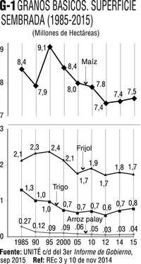 Superficie. En 2015 la siembra de los cuatro granos básicos (Gráfico 1) es de 10.1 millones de hectáreas, una décima más que en 2014 pero lejos de los 12.5 millones de 1995.