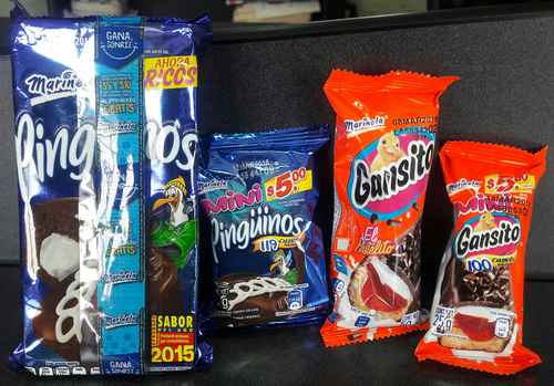 El Gansito y los Pingüinos Marinela, por ejemplo, cuestan ocho y nueve pesos en presentaciones de 50 y 80 gramos, respectivamente, pero ahora vienen en paquetes de 25 y 30 gramos marcados a cinco pesos, así que aunque la gente paga menos, proporcionalmente el producto es más caro por menos cantidad.