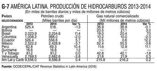 En 2014 Venezuela produjo 2.7 millones de barriles/día de petróleo crudo (-3.8% abajo de 2013), México 2.4 mbd (-3.7%) y Brasil 2.3 mbd (11.4% arriba). De gas natural, México comercializó en el año 50 mil 500 millones de metros cúbicos (-3.6% abajo de 2013), Trinidad y Tobago 42 mil 100 mm3 (-1.8%), y Argentina 36 mil 900 mm3 (-0.1%) (Gráfico 7). Producciones todas ellas afectadas por el desplome de precios y, en consecuencia, de ingresos fiscales.