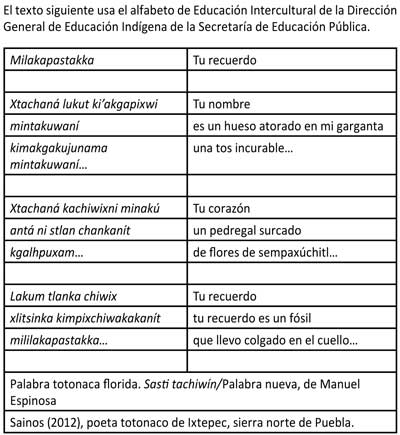 He aquí una versión a la palabra libre de pensamiento; una mirada a la dulce palabra totonaca de la comunidad de El Tajín, Papantla de Olarte, Veracruz: Nuestra lengua totonaca se transmite y conserva de manera oral, ya que su uso es verbal desde tiempos inmemoriales y de esta manera prosigue su habla en la mayoría de las comunidades totonacas con dulzura y elegancia, preservando su diversidad lingüística, es decir, sus variantes regionales de habla; entre más lejos es la variante se va haciendo menos inteligible, por eso hablamos de las grandes variantes lingüísticas que son: la región de Papantla; la región Misantla-Xalapa, Veracruz; la sierra de Puebla, y la sierra norte de Puebla, las cuales hoy se consideran lenguas independientes y autónomas de la familia lingüística totonaca-tepehua; desde luego, antes y después del contacto con los europeos, ya existían esas variantes, que son: chaqawaxti (sierra norte de Puebla), ipapana (sierra baja de Puebla), tatikilhati (costa baja y alta de Papantla) y tatimolo (Naolinco-Misantla, Xalapa-Zempoala, Veracruz). Desde entonces, ya se contaba en El Totonacapan con una gran diversidad lingüística, al igual que la lengua náhuatl o mexicana que, al momento de la conquista española, fue la lengua franca de mayor uso, que constituyó parte del sistema tributario de los aztecas. Para los hablantes y recordantes originarios de la lengua totonaca, esta lengua tiene sentido, un significado diverso, lo que cada quien sabe, lo que cada quien siente hacia dentro, porque cada lengua es todo un mundo de cosas que llevamos en la cabeza, en la boca, en el alma, en la realidad, en la mentalidad, en la mirada propia de cada quien, en el sueño, en el amor, hecha, palpada y nutrida de otras tantas generaciones; es eminentemente social y oral, porque se habla con otra u otras personas, y cuando no hay con quien hablar, entonces estamos dejándola morir. Es la lengua lo que mejor nos distingue a los hombres de los otros seres. Ahora, lo que debemos conservar, cuidar y fomentar es la diversidad lingüística, que es nuestro patrimonio oral intangible, que nos da identidad, no sólo a los totonacas sino a los mexicanos. En México se hablan 364 variantes lingüísticas, que equivalen igualmente a lenguas originarias nacionales, concentradas en 68 agrupaciones lingüísticas y 11 grandes familias lingüísticas (Catálogo de la Lenguas Indígenas Nacionales, Inali, 2008). Así, México es uno de los países con mayor diversidad lingüística del Continente americano, pero ¿qué sucede?, desgraciadamente, la mayoría de nuestras lenguas nacionales se encuentran en riesgo, no es que mueran sus hablantes, sino que rápidamente están siendo desplazadas, además, no están fomentándose ni desarrollándose en las comunidades donde se hablan, tampoco en las escuelas interculturales bilingües. Aunque hay intentos de su preservación y fomento en algunos sectores indígenas, resultan insuficientes. Continúa la castellanización, y nuestras lenguas maternas originarias son ignoradas en todos los ámbitos sociales, lingüísticos y políticos.