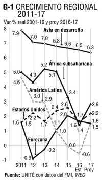 Para 2017 el FMI proyecta una ligera, aunque desigual, re-cuperación del crecimiento glo-bal a 3.4%. Para Estados Unidos estima 2.2%, para la Zona euro 1.5, Reino Unido 1.1, Japón 0.6, África 2.8, América Latina 1.6, Asia 6.3, Rusia 1.1, Europa cen-troriental 3.1 y Medio Oriente y Noráfrica 3.2. Para México la estimación es 2.3% (Gráfico 2).