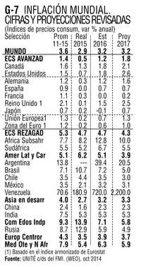 El FMI ha elevado su estima-ción de inflación mundial este año de 2.9% en abril a 3.2 ahora en octubre. Para México se pro-nostica de 3.2. Para Argentina la expectativa es grave 39.4; y para Venezuela es catastrófica 720% (y 2,200 en 2017) (Gráfico 7).