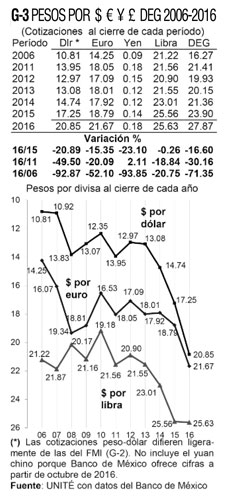 omando como referencia el Derecho Especial de Giro (DEG), la unidad de cuenta que el Fondo Monetario Internacional calcula diariamente ponderado las alzas y bajas que entre sí presentan las cinco monedas de su canasta de divisas (el yuan chino fue incorporado el 1o de octubre pasado), tenemos que en 2016 se fortalecieron frente al DEG el dólar (3.29%) y el yen (6.38), mientras que se debilitaron el euro (-0.72%), la libra (-0.74) y el yuan (-3.60) (Gráfico 1).