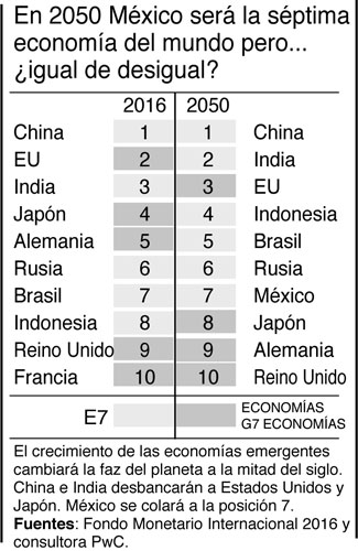 En la situación crítica que vivimos es difícil imaginar que México llegará a ocupar el lugar número siete entre las economías del mundo. Sin embargo, hay quienes lo auguran. Y no es promesa del político mexicano. Felipe Calderón alguna vez presentó el plan 20-30, según el cual México sería una sucursal del paraíso en el año 2030. Se trata de un estudio ajeno a partidos realizado por la consultora PwC (PriceWaterhouse Coopers), el cual indica que el PIB se triplicará y superará los 3 billones de dólares. Los mercados emergentes seguirán siendo el motor del desarrollo mundial. Seis de las siete economías más grandes del mundo serán países hoy emergentes, liderados por China y la India en primero y segundo lugares. México ocupará el número siete. Sin embargo, necesitarán mejorar sus instituciones y su infraestructura de manera significativa si pretenden desarrollar su potencial de crecimiento a largo plazo.