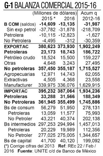 or segundo año consecutivo, la balanza comercial de México registró un elevado déficit de -13 mil 135 millones de dólares, al cual contribuyó casi en su totalidad el déficit petrolero que ascendió a -12 mil 823 millones (Gráfico 1).