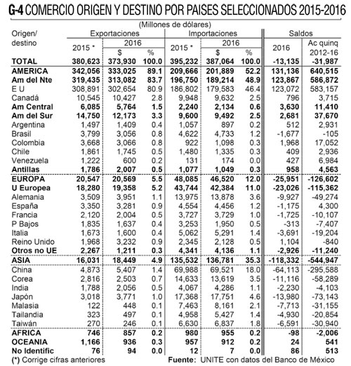 Del total de productos exportados desde México en 2016, el 89.1% tuvieron a América como destino (y de ellos el 80.9% a Estados Unidos como resultado lógico de la relocalización global de las transnacionales más que de una capacidad productiva propia); a Europa fue el 5.5%, a Asia el 4.9, a Oceanía el 0.3, y a Africa el 0.2% (Gráfico 4).