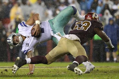 En otra destacada actuación de Ezekiel Elliot, con un par de touchdowns, los Vaqueros de Dallas doblegaron 33-19 a los Pieles Rojas de Washington, en un clásico de la División Este de la Nacional, que se disputó bajo intensa lluvia en un sector que encabezan las Águilas de Filadelfia con el triunfo de 33-10 frente a San Francisco.