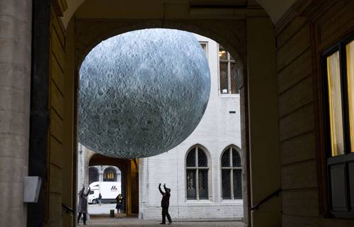 En el Museo de la Luna, en Bruselas, dos personas se acercan a la instalación artística que brinda por única vez la oportunidad de contemplar el satélite natural en tres dimensiones, suspendido en el centro del patio históricoFoto Ap