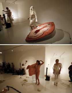 ▲ Aspectos del performance que Genoveva Álvarez presentó en el recinto de la colonia San Rafael, donde se exhibe la obra Los efectos de la presión y la súbita expulsión.