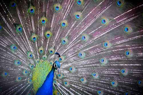 ▲ El pavo real, uno de los animales que han cautivado a los humanos por la majestuosidad y belleza de su plumaje, es originario de India. Se cuenta que fue llevado a Europa por Napoleón y después a distintas partes del mundo. En la imagen se observa uno de los ejemplares que posee el parque Legendia en Frossay, en el oeste de Francia.Foto Afp