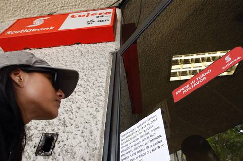 ▲ Los servicios de Scotiabank fueron suspendidos a partir de las 15 horas de ayer en todo el país, tanto en sucursales como en Internet, por motivos de actualización. Serán reanudados el lunes, informó el banco. Explicó que aunque sus clientes no podrán hacer uso de cajeros automáticos, sí podrán utilizar los de la red ATM de otros bancos sin cobro de comisión.Foto Roberto García Ortiz
