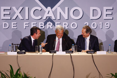 ▲ El presidente Andrés Manuel López Obrador, luego del encuentro en Palacio Nacional para la instalación del Consejo para el Fomento de la Inversión, el Empleo y el Crecimiento Económico, acudió a la sesión del Consejo Mexicano de Negocios (CMN) en la que Antonio del Valle Perochena (derecha de la imagen) asumió como nuevo titular del organismo; también aparece Alejandro Ramírez, director general de Cinépolis. El mandatario señaló que la función social del sector empresarial es generar inversión y empleos. Foto Cristina Rodríguez