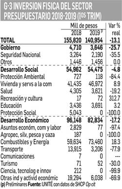La inversión física del sector público se redujo -13.1% respecto al primer trimestre de 2018, aunque debe considerarse el carácter inicial de este año. Destaca la caída de inversión en transporte -77.9%, en instalaciones de salud -19.2, y en seguridad nacional -35.5; así como la nula inversión en el campo y en protección social (Gráfico 3). En positivo, la inversión física para la educación aumentó 3.2%, la de vivienda y servicios a la comunidad 8.9, y la inversión en energía y combustibles 18.3%