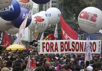Fuera Bolsonaro, fue la consigna en las manifestaciones de ayer contra la administración del mandatario neofascista en Brasil. En las más importantes ciudades hubo movilizaciones por el bloqueo al presupuesto para el sector educativo y la reforma al sistema de jubilaciones que se debate en el Senado. La imagen, en la Avenida Paulista, en Sao Paulo. Foto Ap