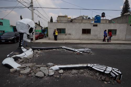 El mal estado de la carpeta asfáltica fue aprovechado por Raymundo Medina para montar dos enormes calaveras de cartón que emergen de las entrañas de la tierra en la calle de Francisco Santiago Borra, en la colonia Santa Cecilia, y llamar la atención de las autoridades de Tláhuac para repararla.