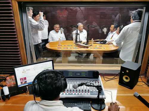 López Obrador, acompañado del gobernador Adán Augusto López Hernández, del partido Morena, durante su más reciente gira por la entidad, el 28 de febrero, estuvo en las instalaciones de la radiodifusora y dialogó con conductores y personal para expresar su satisfacción por revivir la estación.