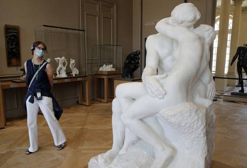 ▲ El Museo Rodin, en París, reabrió ayer sus puertas, aunque con la preocupante pérdida de visitantes y de ingresos a consecuencia del cierre de cuatro meses por la pandemia del Covid-19. Catherine Chevillot, directora del sitio, estimó el déficit en unos 4.4 millones de euros. Agregó que para obtener 1.4 millones de euros se venderán réplicas en bronce de piezas del escultor francés. Una visitante observa El beso, una de las obras más famosas del artista, quien fundó hace más de un siglo un museo en esta antigua mansión, en cuyos jardines se exhiben reconocidas obras como El pensador o La puerta del infierno, inspirada en La divina comedia.Foto Ap