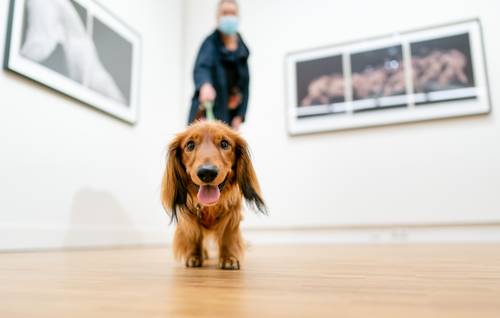 ▲ Un visitante y su perro recorren la exposición Being Human, de William Wegman, que se aloja en el Fotomuseo de La Haya. La muestra se abrió a las mascotas para conmemorar el Día Mundial de los Animales.Foto Afp
