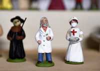 pequeños santos, tradicionales figurillas de arcilla que adornan los nacimientos durante la época navideña en la región de Provenza, en Francia. A finales del siglo XVIII se inició la costumbre de representar el nacimiento de Jesús con piezas hechas a mano. Con el tiempo, se agregaron personajes del pueblo, como el cura, el alcalde o la pescadera, así como celebridades y personajes históricos. La artesana Fabienne Pardi incluyó este año al científico Didier Raoult, especialista en enfermedades infecciosas en Marsella y asesor del gobierno francés en la lucha contra el Covid-19. Foto Afp