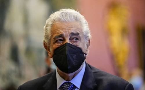 ▲ El tenor Plácido Domingo, estrella de la ópera española, obtuvo ayer un reconocimiento en el Teatro Real de Madrid, un día después de recibir ovaciones por su primera actuación en su país desde que el Sindicato de Artistas Musicales de Estados Unidos concluyera que se había comportado de forma inapropiada con varias mujeres. A su llegada al acto, en el que se le concedió el título de Embajador Honorario del Patrimonio Mundial de España, Domingo habló del orgullo que sentía por estar de vuelta.Foto Afp