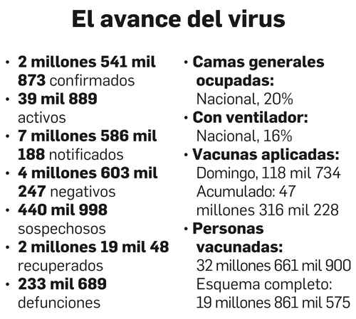 Entre el domingo y lunes se confirmaron mil 805 casos de Covid-19 y 67 decesos, por lo que el registro acumula 2 millones 541 mil 273 personas que han enfermado y 233 mil 689 que han fallecido por complicaciones graves de la infección.