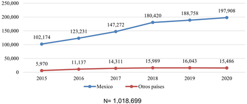En la gráfica se puede observar que de 2015 a 2020 hubo una emisión total de 1,018,699 visas H2A. En ese periodo, México recibió un total de 939,763 visas H2A que corresponde al 92% y el resto de los otros países 78,936 visas H2A que corresponde al 8%.
