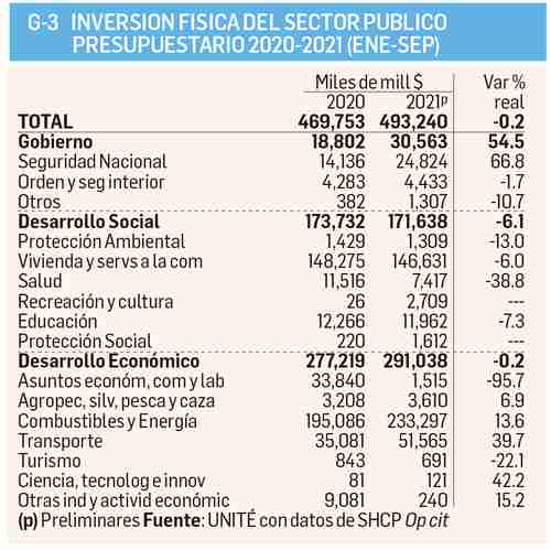 La inversión física (construcción y equipo) del sector público totalizó en el periodo 493 mil millones de pesos, -0.2% real respecto a su equivalente de 2020 (Gráfico 3). De esta inversión, la de gobierno (seguridad básicamente) fue de 31 mil millones (54.5% más que en 2020); la de desarrollo social de 172 mil millones (-6.1%); y la de desarrollo económico de 291 mil millones (-0.2%), aunque de éstas las destinadas a combustibles y energía fueron de 233 mil millones (13.6% más que en 2020).