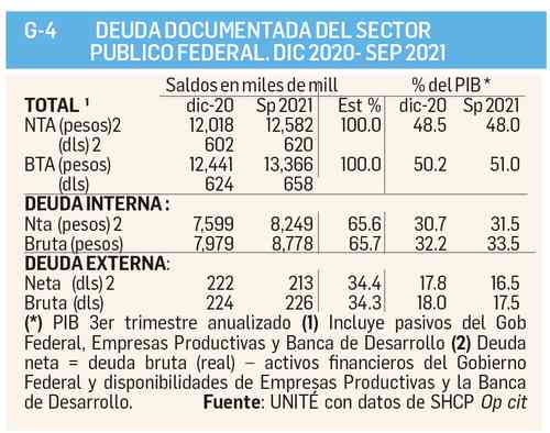 La deuda pública federal ascendió en septiembre a un total bruto de 13.366 billones de pesos, cifra superior en 925 mil millones a la de diciembre 2020, aunque aun equivalente a 51.0% del PIB (50.2 en diciembre) (Gráfico 4). Del total, la deuda interna se elevó a 8.778 billones de pesos (33.5% del PIB), y la externa creció marginalmente a 226 mil millones de dólares (17.5% del PIB).