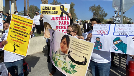 ▲ Unas 300 personas se manifestaron frente a la clínica 30 del IMSS en esta ciudad bajacaliforniana para exigir justicia por el deceso de Keren Vallejo Castro, quien murió minutos después del nacimiento de su segundo hijo por hemorragia debido a desgarro uterino; su cuerpo se entregó para la necropsia sin órganos; los familiares exigieron que no quede impune la negligencia médica. El caso fue atraído por la FGR tras denuncia de Michel Cortés, esposo de la fallecida, contra personal del instituto. Foto Omar Martínez. A. Heras y D. Pérez