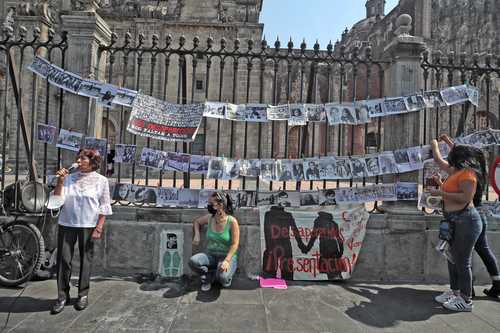 Afuera de las rejas de la Catedral Metropolitana –donde en 1978 madres de desaparecidos iniciaron su primera huelga de hambre–, el Comité Eureka realizó un homenaje ciudadano a Rosario Ibarra. Ahí se instaló un tendedero con fotos de jóvenes secuestrados por agencias del Estado.