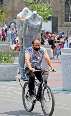 ▲ Un comerciante transporta dos maniquís en su bicicleta en la Ciudad de México. Foto Roberto García Ortiz