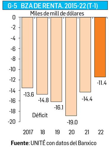 La balanza de renta (utilidades de la inversión directa, intereses sobre deuda...) también en déficit crónico, registró números rojos por -11 mil 366 mdd (Gráfico 5).