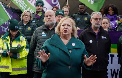 ▲ Miles de trabajadores de ambulancias de Inglaterra y Gales se declararon en huelga ayer en demanda de aumento salarial, aumentando la presión sobre el sistema de salud estatal, que ya enfrenta un paro de enfermeras. El secretario de Salud y Asistencia Social, Steve Barclay, aseveró que los trabajadores no han estado dispuestos a cooperar para acordar excepciones en términos de cobertura. Christina McAnea, líder sindical (en la imagen), se declaró “escandalizada” por dichos comentarios. “Barclay sabe que hay planes detallados en las áreas locales, sus acusaciones son una distracción ante los fallos del gobierno y su negativa a resolver este conflicto”, afirmó.Foto Afp