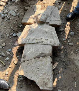 ▲ Alejandra Frausto, titular de la Secretaría de Cultura federal, y Lilia Arrieta, alcaldesa de Álamo Temapache, informaron del hallazgo de una escultura similar en dimensión y tallado a la Joven gobernante de Amajac, descubierta en enero de 2021. La obra muestra el sincretismo entre las culturas tének y mexica en los siglos XV y XVI. Foto del Facebook de Lilia Arrieta. / Redacción