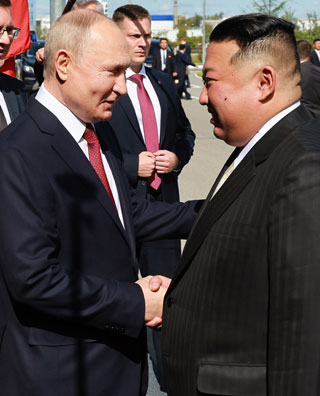 ▲ El presidente Vladimir Putin recibió a su homólogo Kim Jong-Un en el cosmódromo de Vostochni, en el lejano oriente de Rusia. Ambos expresaron su deseo de llevar la relación al más alto nivel. el dirigente norcoreano refrendó su apoyo a la campaña militar de Moscú en Ucrania. Nada trascendió de las pláticas, pero expertos señalan que la visita fue para acordar la entrega de equipo bélico al ejército ruso a cambio de que el Kremlin aporte petróleo, cereales y tecnologías de su industria espacial. Foto Ap. / Juan Pablo Duch