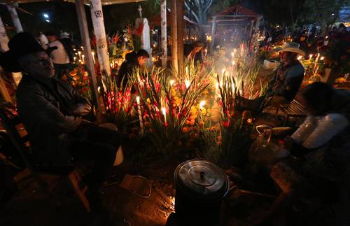 ▲ Como cada año, habitantes del municipio de Santa María Atzompa, conurbado a la capital de Oaxaca, acuden al panteón para velar a sus difuntos; para ello, adornan las tumbas con velas y flores de cempasúchil, con lo que, según la creencia, alumbran su camino hacia el mundo de los vivos. Los pobladores de esa comunidad zapoteca pernoctan en el camposanto junto a las tumbas de sus seres queridos.Foto Jorge A. Pérez Alfonso