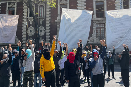 ▲ Por segundo día, como parte de la jornada de lucha Contra el muro de la impunidad, familiares de los 43 estudiantes de Ayotzinapa desaparecidos se manifestaron en las afueras de la Secretaría de Gobernación para exigir que se concrete una reunión con el presidente Andrés Manuel López Obrador. En la manifestación, un grupo de presuntos normalistas encapuchados realizó pintas en una de las entradas del inmueble y lanzó al menos cuatro petardos a su interior. Foto Roberto García Ortiz. / Jared Laureles y Jessica Xantomila